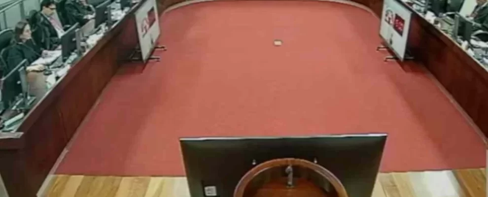 Juízes em toga sentados em uma sala de audiências em formato de U, com monitores e um grande tapete vermelho.
