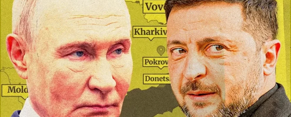 Vladimir Putin e Volodymyr Zelensky em frente a um mapa da Ucrânia com nomes de cidades como Kharkiv e Donetsk.