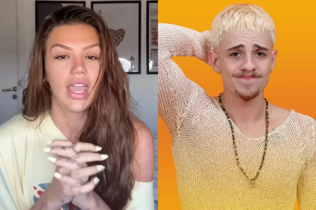 Bianca Andrade e Fred Bruno em imagem dividida, com a influenciadora falando e o influenciador com a mão atrás da cabeça.