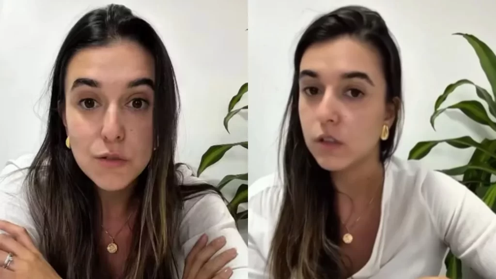 Duas imagens lado a lado de uma mulher com cabelos escuros, usando brincos dourados e um colar com pingente redondo, falando.