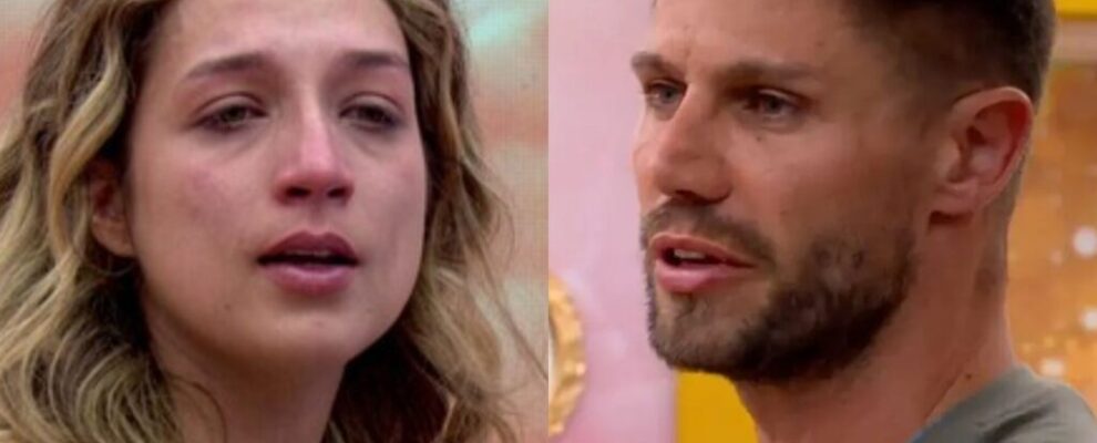 Juliette Freire e Rodolffo Matthaus em momento de tensão no BBB 21. Juliette chora enquanto Rodolffo fala.