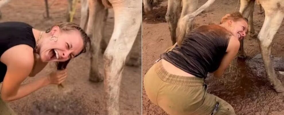 Mulher rindo enquanto é atingida por urina de vaca em fazenda. Imagem dividida mostra a reação em dois momentos.