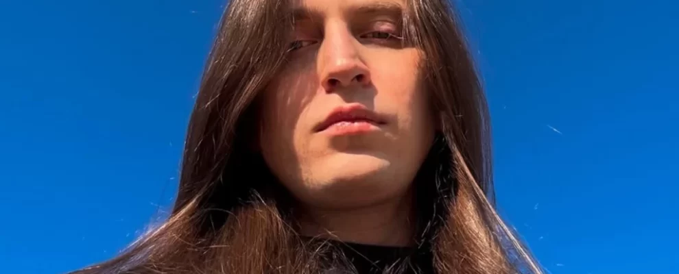 Jovem com cabelos longos e castanhos olha para a câmera contra um céu azul claro. A luz do sol ilumina seu rosto.