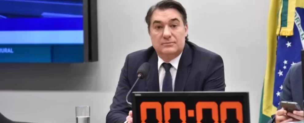Deputado Giacobo, presidente da CAPADR, em reunião com a bandeira do Brasil ao fundo e um cronômetro digital.