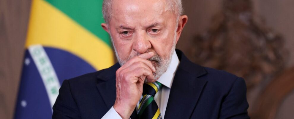 Luiz Inácio Lula da Silva, presidente do Brasil, com a mão no queixo, pensativo, com a bandeira do Brasil ao fundo.