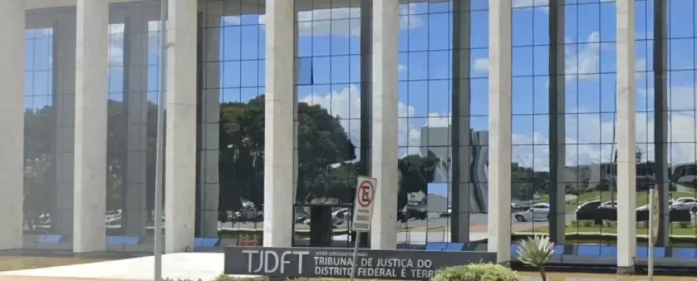 Fachada do Tribunal de Justiça do Distrito Federal e Territórios (TJDFT) em Brasília, com arquitetura moderna e janelas espe…