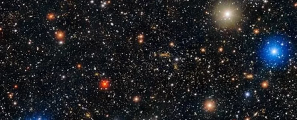 Imagem do espaço profundo com inúmeras estrelas de cores variadas, incluindo azuis, brancas e alaranjadas, em um fundo escur…