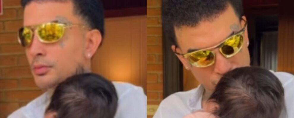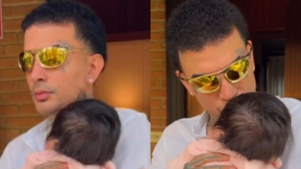 MC Guimê compartilhou um vídeo encantador em que aparece ninando e beijando a testa de sua filha, Yarin, que completou 3 meses de vida.