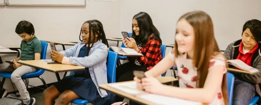 Crianças em sala de aula usando celulares em vez de prestar atenção na aula. Meninas e meninos sentados em carteiras.