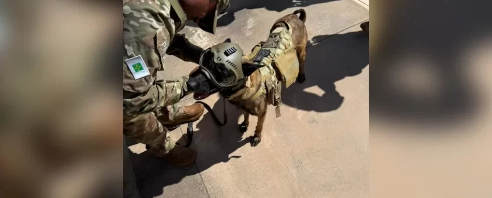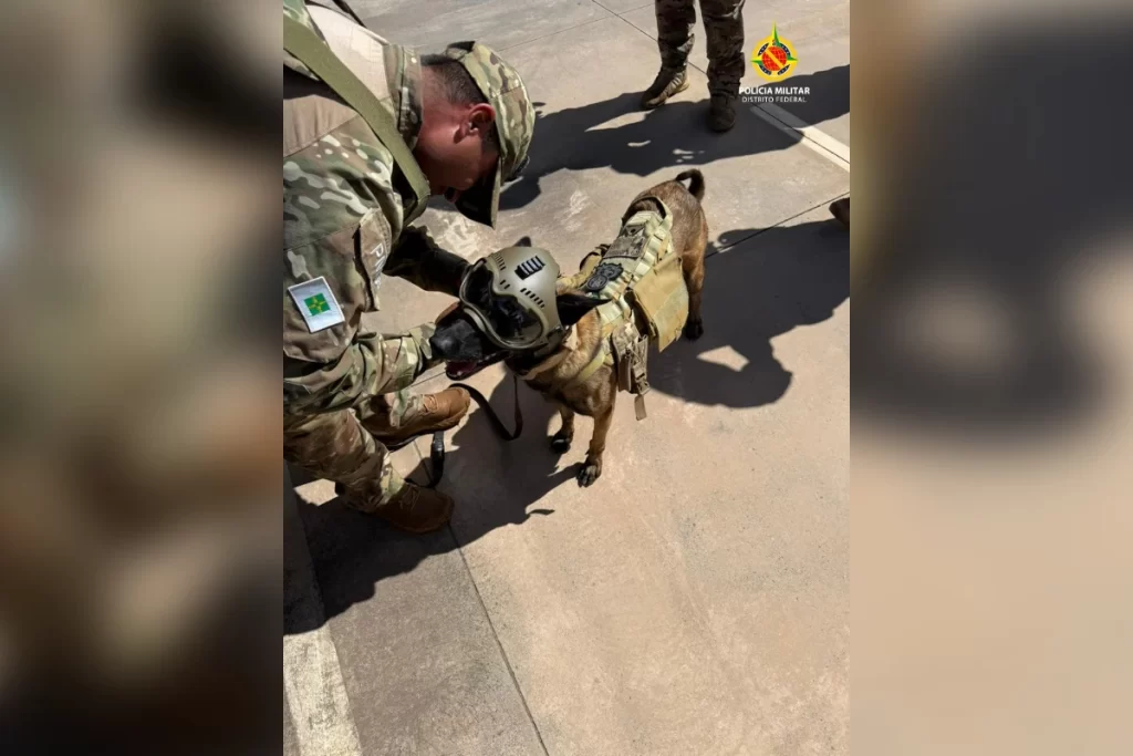 Policial militar do Distrito Federal interage com cão farejador equipado para operações. Imagem mostra treinamento.