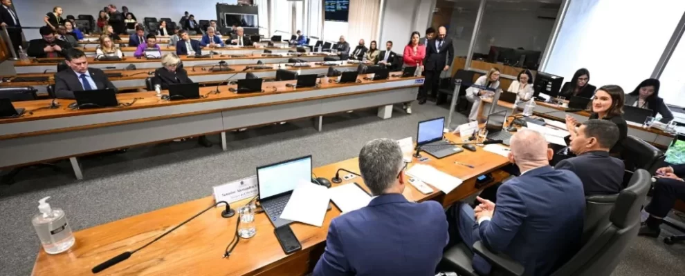 Senadores em reunião em plenário, com mesas, laptops e microfones. Pessoas sentadas e em pé discutindo.