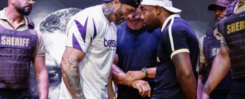 Boxers KSI e Tommy Fury se encaram intensamente, cercados por seguranças com coletes de xerife, antes de uma luta.