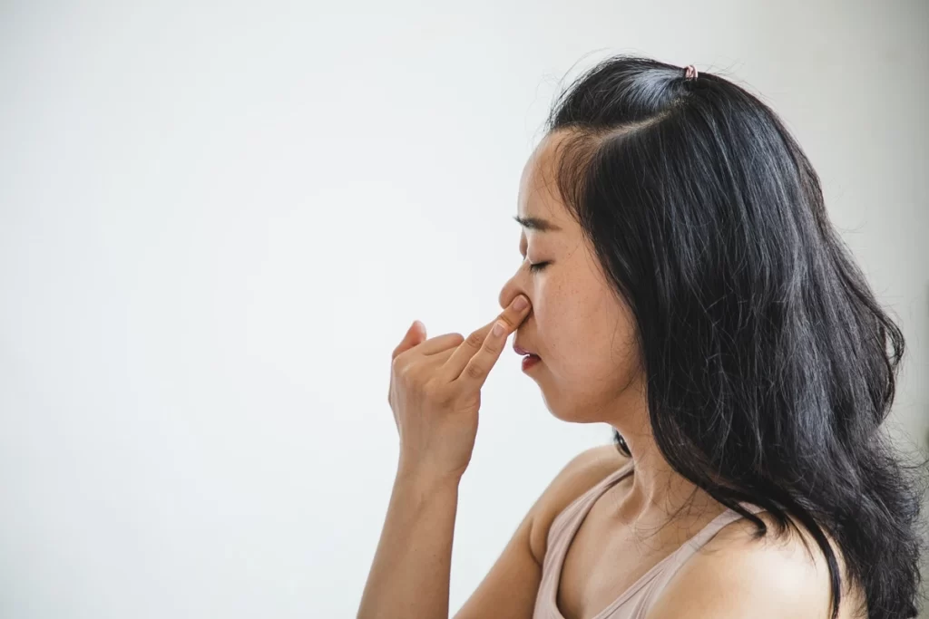 Mulher asiática com olhos fechados e dedos no nariz, praticando respiração nasal em um fundo branco.