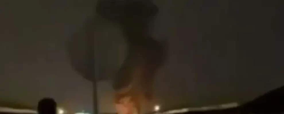 Homem observa fumaça e chamas subindo de um prédio à noite, com luzes ao fundo.
