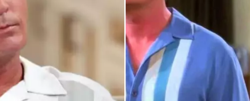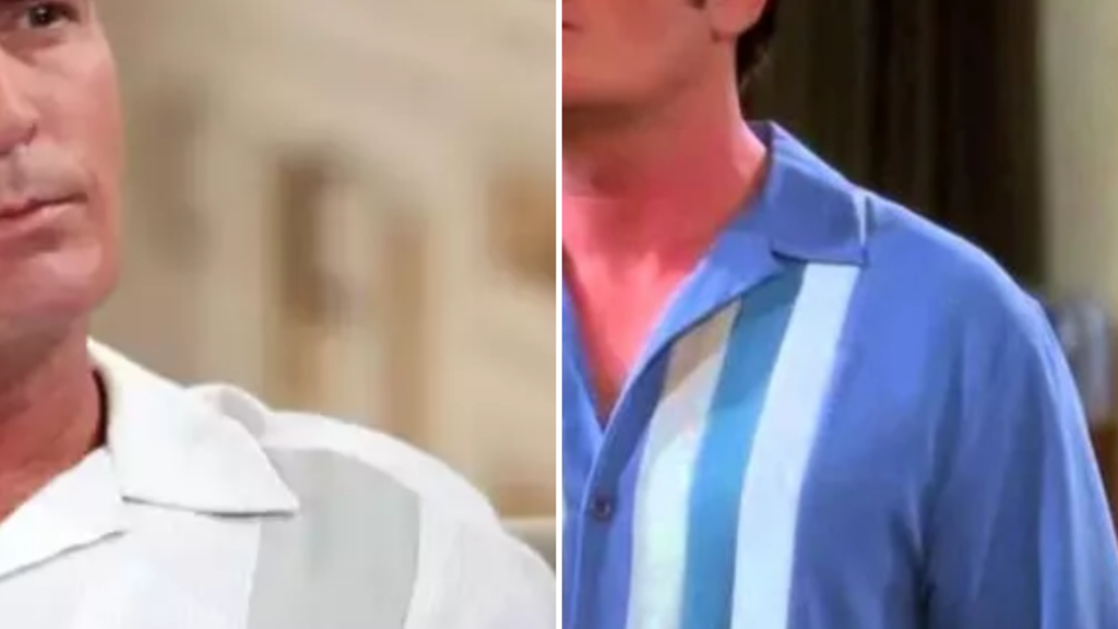 Charlie Sheen e Jon Cryer em cena da série Two and a Half Men, ambos vestindo camisas com listras.