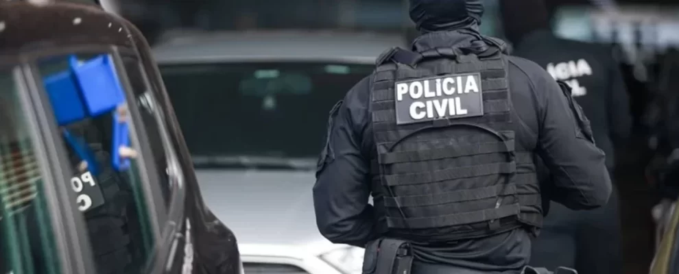 Policial civil uniformizado com colete tático em frente a carros, em ação.