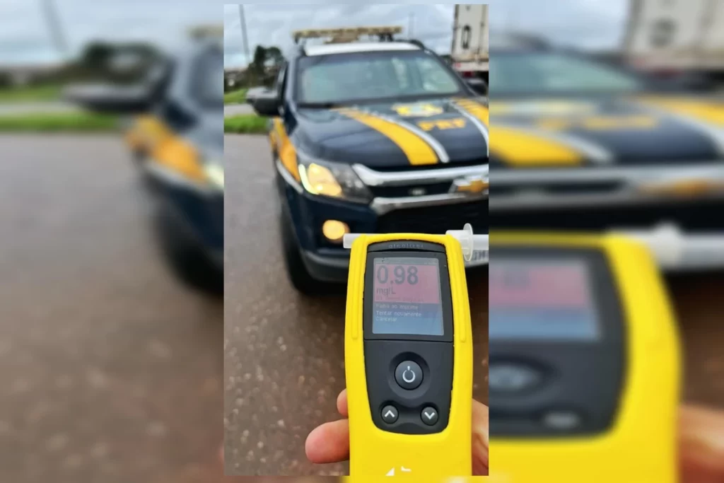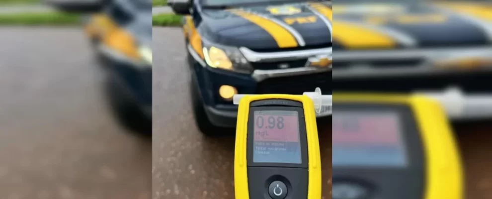 Aparelho de bafômetro com resultado de 0,98 mg/L em frente a uma viatura da Polícia Rodoviária Federal (PRF).