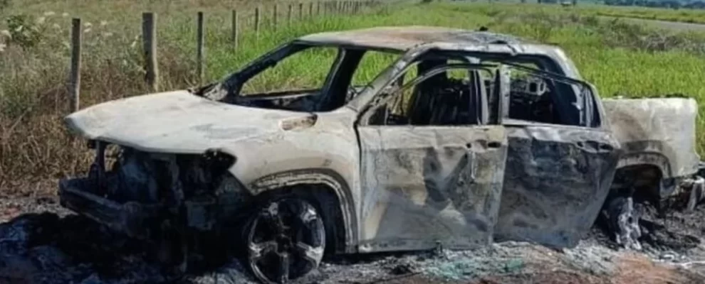 Um corpo carbonizado foi encontrado dentro de uma caminhonete Fiat Toro incendiada em uma área rural da cidade, na fronteira com o Paraguai.
