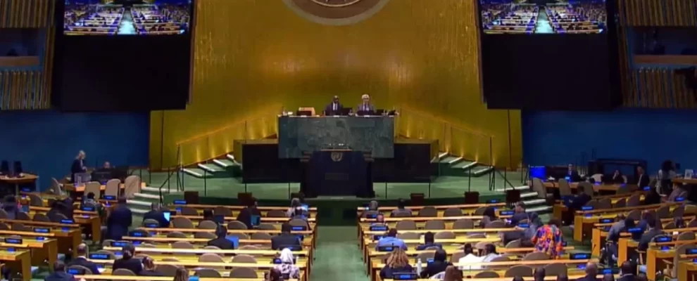 Assembleia Geral da ONU em Nova York, com delegados sentados em fileiras e autoridades no pódio.