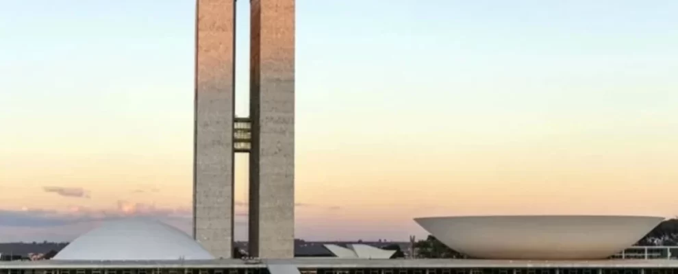 Congresso Nacional em Brasília, com suas torres gêmeas e a cúpula do Senado, ao pôr do sol.