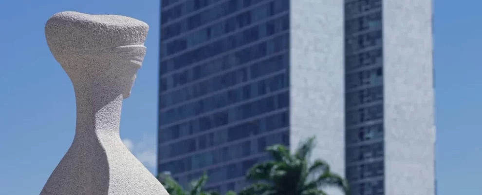 Escultura da Justiça com os olhos vendados em frente ao Congresso Nacional em Brasília, Brasil.