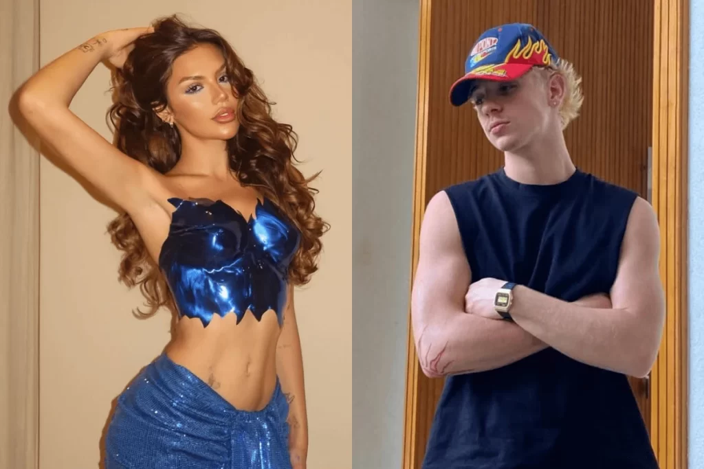 Jade Picon e João Guilherme em montagem de fotos. Ela usa um top azul brilhante e saia, ele usa boné e camiseta preta.