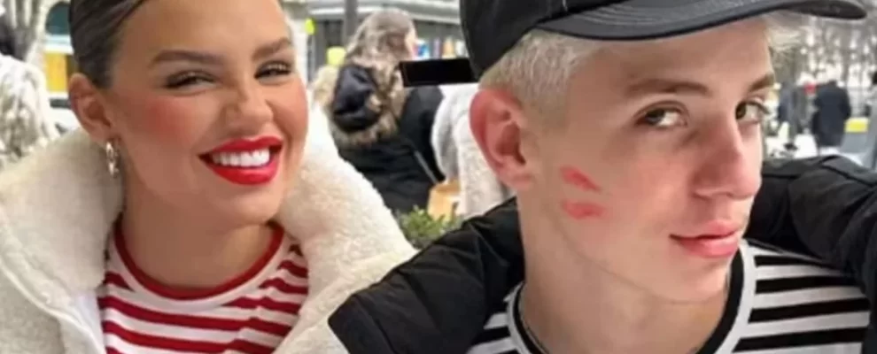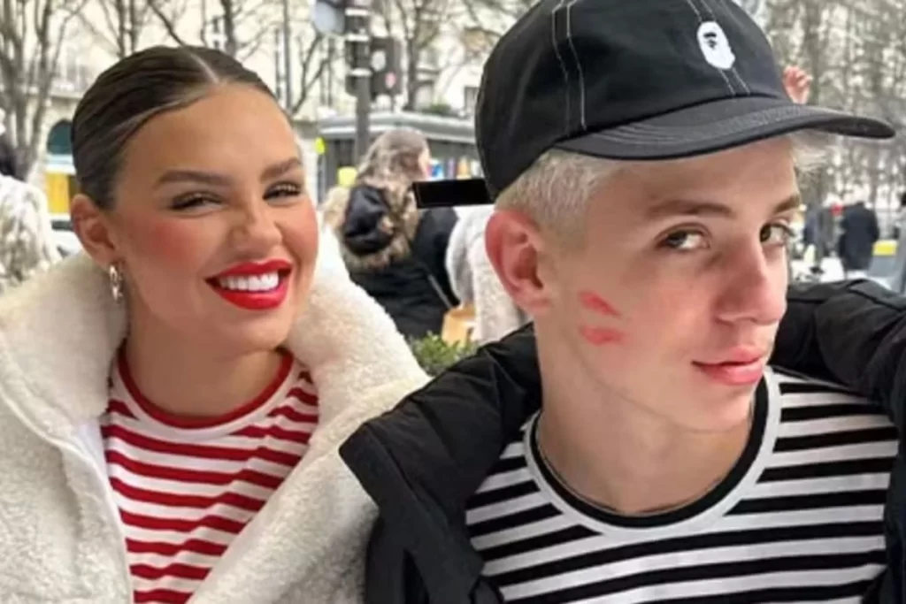 Influenciadora Virginia Fonseca e o cantor Zé Felipe em Paris, França. Zé Felipe aparece com marcas de batom no rosto.