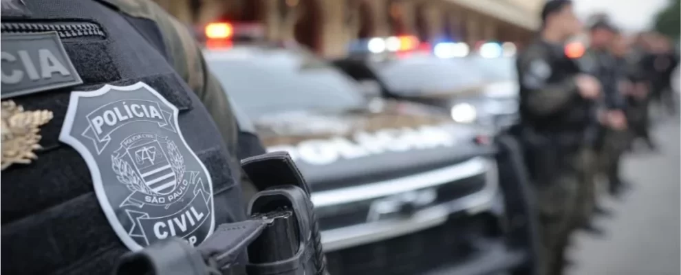 Policial civil de São Paulo em uniforme tático, com distintivo e viaturas ao fundo. Imagem de segurança pública.