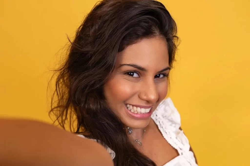 Mulher sorrindo com fundo amarelo. Ela tem cabelo escuro e usa uma blusa branca com detalhes em renda.