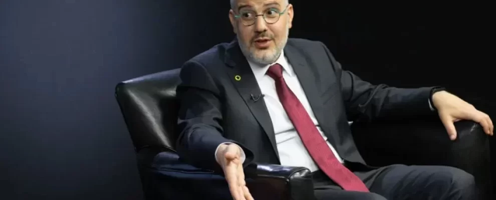 Homem careca de óculos e terno escuro com gravata vermelha gesticula sentado em poltrona preta.