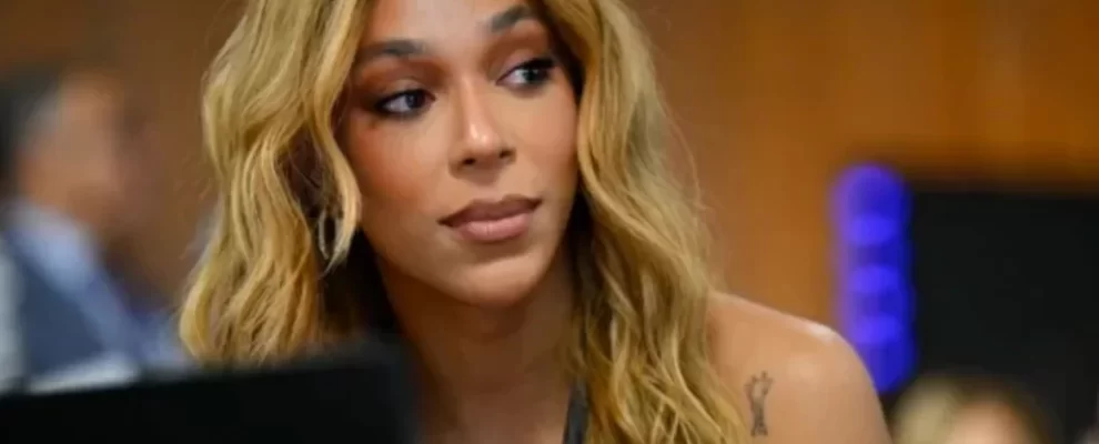 Laverne Cox, atriz trans, com cabelo loiro ondulado e maquiagem marcante, olha para o lado em um ambiente interno com fundo …