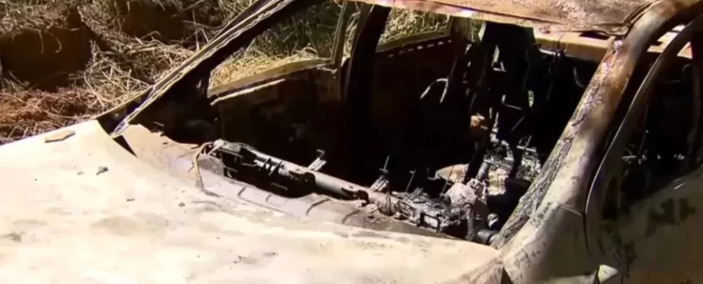 Carro completamente destruído e queimado em meio à vegetação seca. Interior do veículo carbonizado.