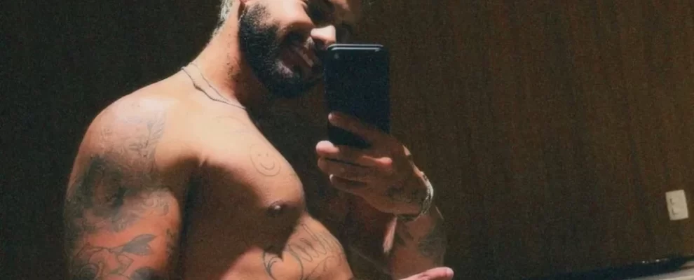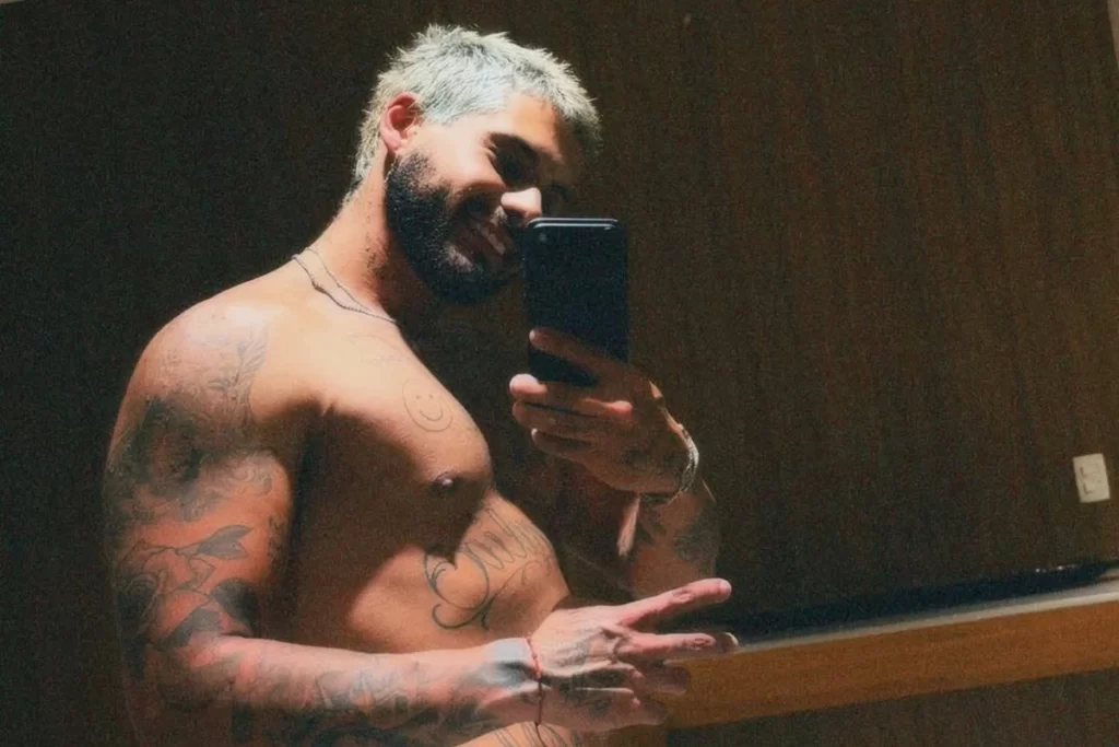 Maluma sorri para a câmera enquanto tira uma selfie, mostrando seus braços e peito tatuados. Ele tem cabelo loiro platinado …