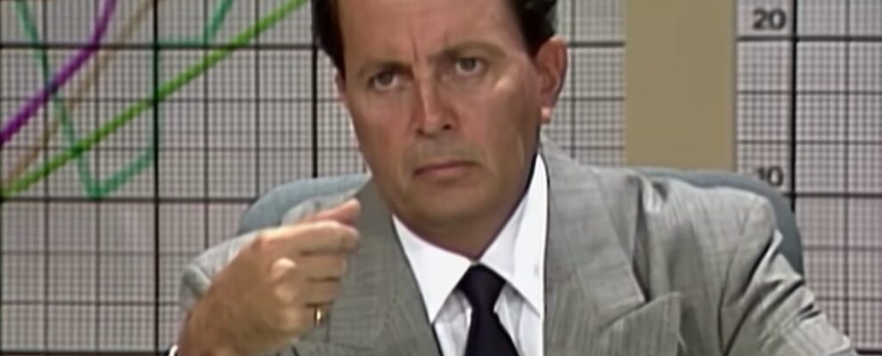 Homem de terno cinza com gravata escura gesticula com a mão em frente a um gráfico de linhas e barras em um cenário de escri…