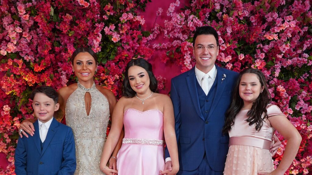 O ponto alto da noite, sem dúvida, foi a tradicional valsa. Maria Clara teve a honra de dançar com seu pai, o cantor Vinicius, ao som da emocionante música ’93 Million Miles’. Um momento de pura conexão e amor entre pai e filha, que arrancou lágrimas de emoção dos presentes. Mas a noite de homenagens não parou por aí! A debutante também compartilhou a pista com figuras importantes de sua vida: seu padrinho, o colega de dupla João Bosco, e seu tio Adilson, ao som de ‘My Way’. E para fechar com chave de ouro essa dança especial, ela fez uma coreografia com seu irmão, Davi, embalada pela clássica ‘A Whole New World’. Cada dança representava um laço, uma lembrança, um futuro.