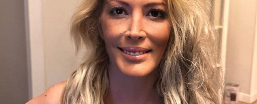 Mulher loira sorri para a câmera com cabelo ondulado e maquiagem leve. Ela usa uma blusa sem alças.