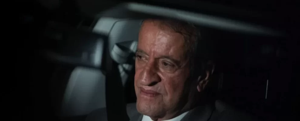 Homem de terno e gravata vermelha, sentado em um carro, com iluminação dramática.