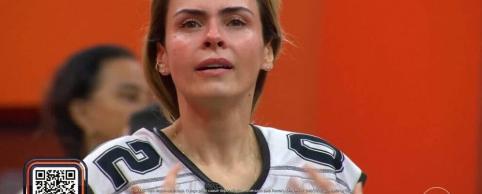 Participante do BBB 23, Amanda Meirelles, em momento de emoção durante o programa. Ao fundo, outra participante desfocada.