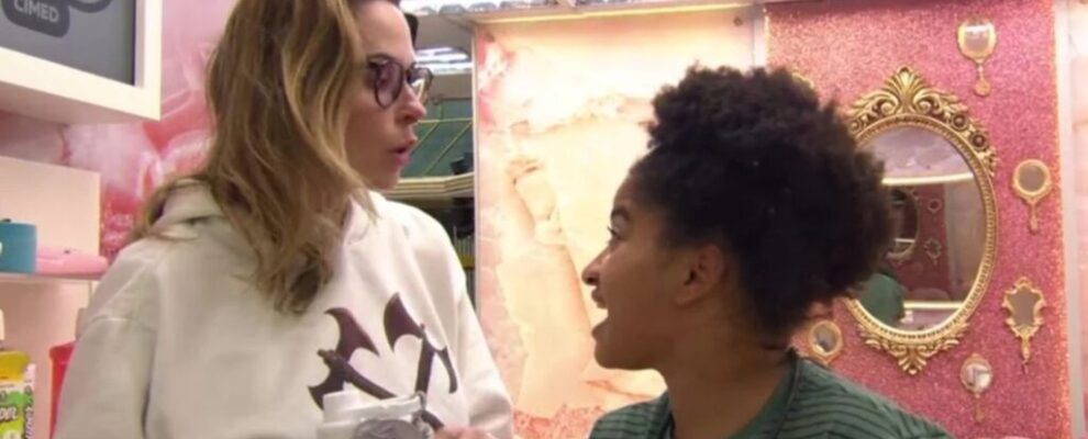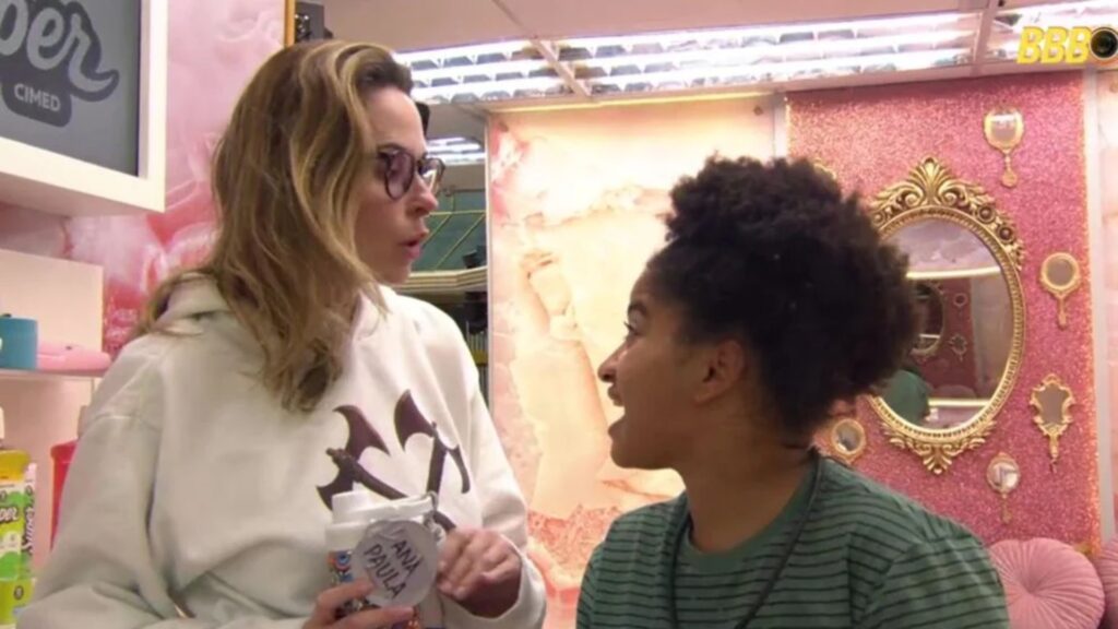 Ana Furtado e participante do BBB 23 conversam em ambiente decorado com espelhos e tons rosados. BBB 23.