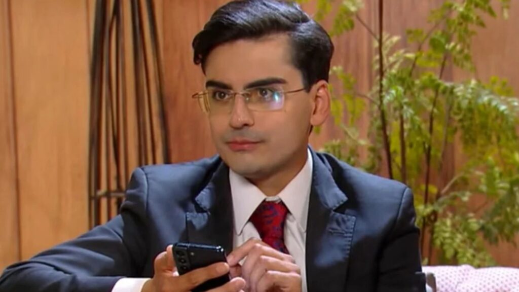 Homem de terno e gravata vermelha, usando óculos, olha para o celular em um ambiente interno com plantas.
