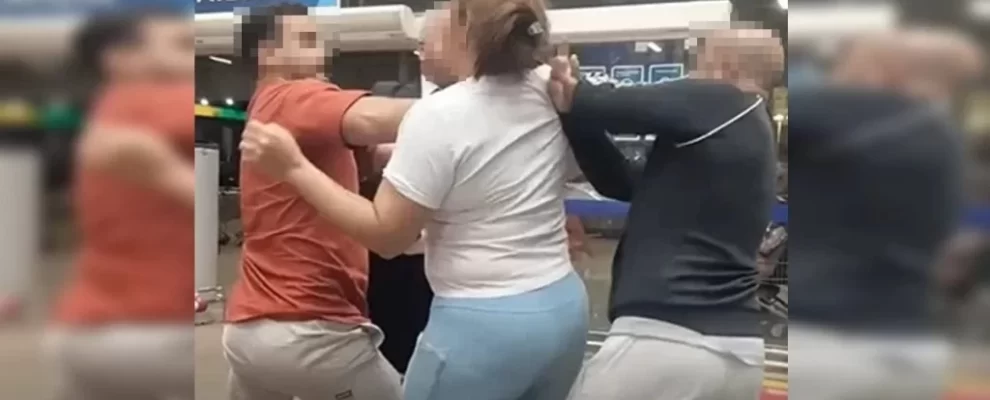 Um homem usou uma mulher como escudo humano durante uma briga generalizada entre clientes dentro de um supermercado atacadista.