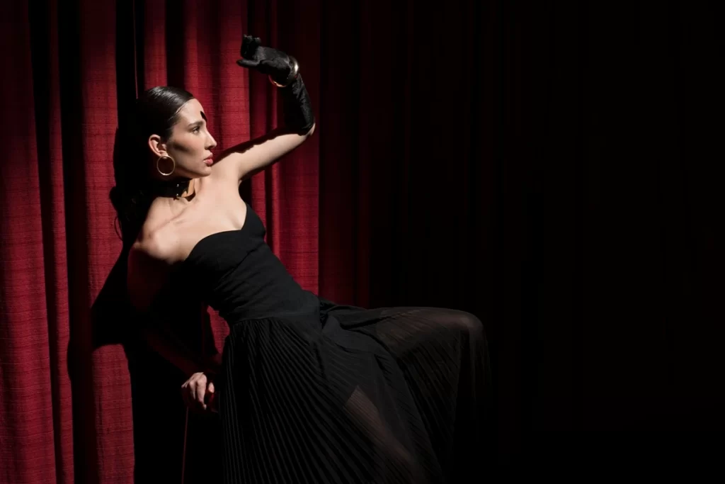 Mulher com vestido preto e luvas pretas, em pose dramática contra cortina vermelha e fundo escuro.