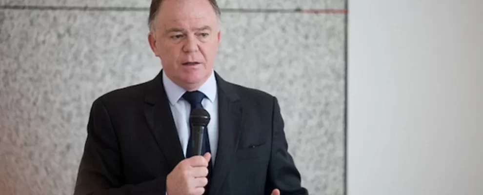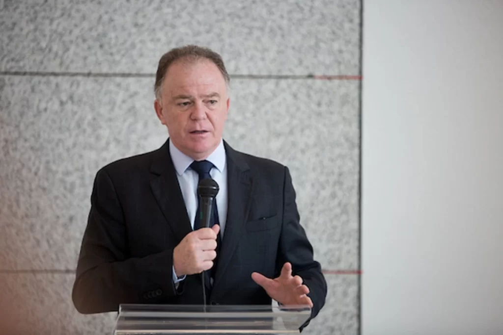 Homem de terno escuro e gravata azul fala ao microfone em um pódio, com fundo texturizado e branco.