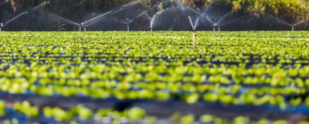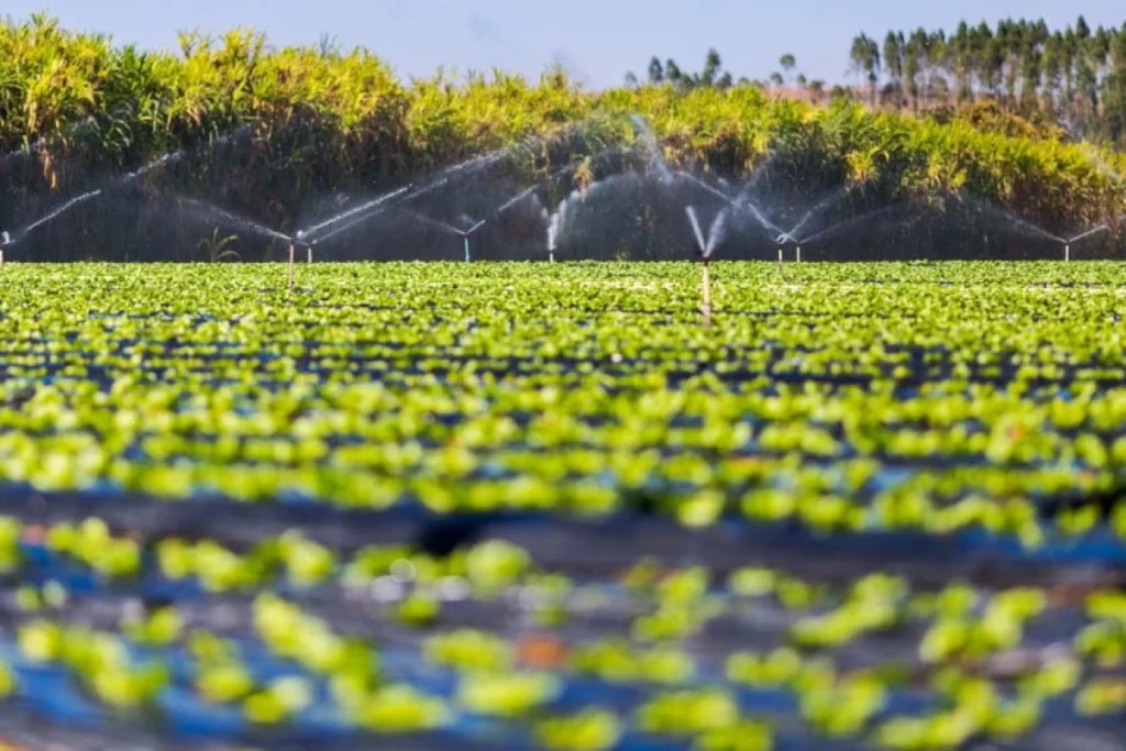 Irrigação em larga escala em plantação de hortaliças com aspersores em funcionamento e vegetação ao fundo.