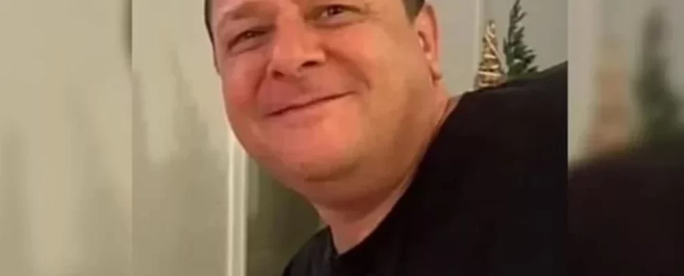 Homem sorri para a câmera em um close-up, vestindo uma camiseta preta. Ao fundo, uma parede clara e uma árvore de Natal deco…