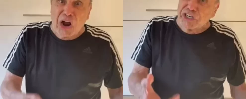 O ator e humorista Paulo Silvino em vídeo com expressão facial intensa e gestos com as mãos, vestindo camiseta preta com lis…