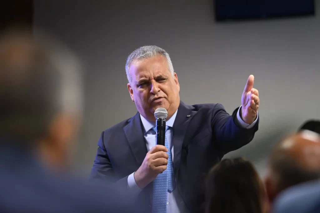 Homem de terno azul e gravata azul claro fala em um microfone com a mão direita estendida.