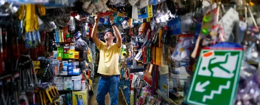 Homem de camiseta amarela e jeans em loja de ferragens, olhando para o teto cheio de produtos. Sinal de saída de emergência …