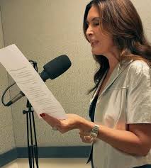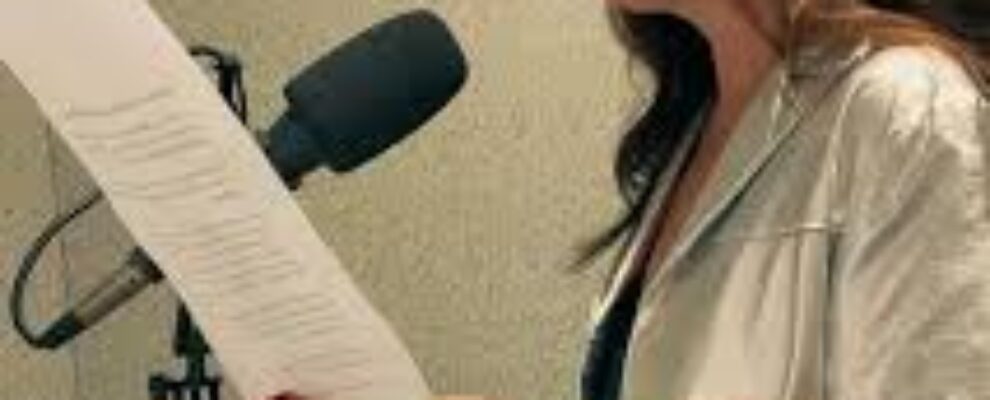 Atriz brasileira Carolina Dieckmann gravando áudio em estúdio com microfone profissional e roteiro em mãos.