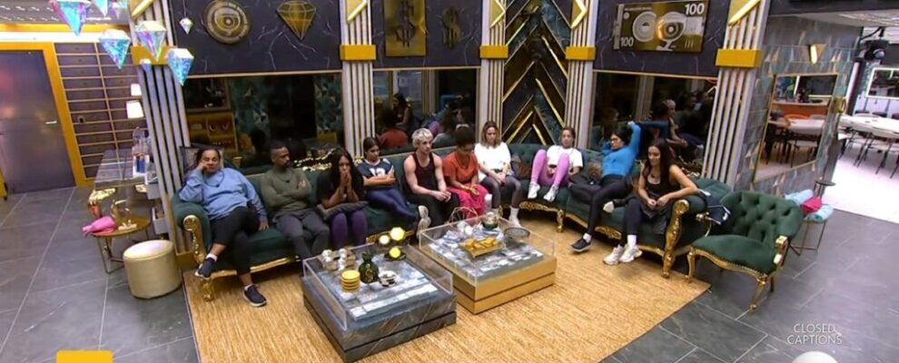 Participantes do BBB 23 sentados em sofás e poltronas em uma sala luxuosa com decoração moderna e elementos dourados.